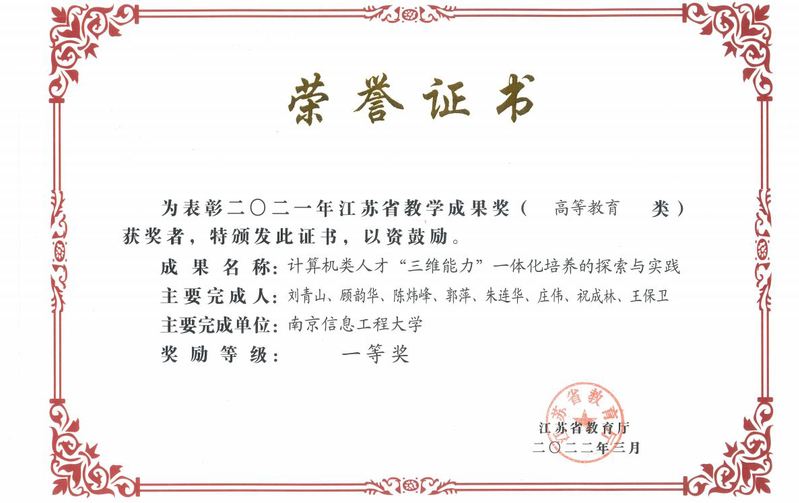 | 2021年 | 计算机类人才“三维能力”一体化培养的探索与实践 | 江苏省教学成果一等奖 | 省级 | 江苏省教育厅 |