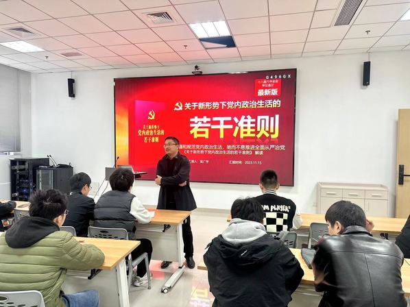 人工智能学院党委书记吴广宇为全体发展对象作《关于新形势下党内政治生活的若干准则》(以下简称《准则》)解读讲座。吴广宇从《准则》制定的背景、《准则》的主要内容、《准则》的贯彻落实三个方面向同学们讲解了新形势下加强和规范党内政治生活的具体要求,希望同学们严守党的政治纪律和政治规矩,锻造忠诚品格,永葆共产党人政治本色。