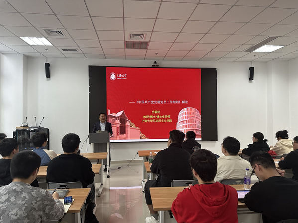上海大学马克思主义学院教授岳爱武以《规范发展党员工作程序,不断提高新发展党员的质量》为主题,对《中国共产党发展党员工作细则》进行解读。他提到,党员质量关乎党的建设整体质量,提高党员质量是永葆党的先进性、纯洁性的关键。加强党员质量建设不仅体现在党员的思想建设上,也体现在党员的本领建设上。同学们既要用崇高的理想信念筑牢信仰之基,做共产主义远大理想和中国特色社会主义共同理想的坚定信仰者、忠实实践者,也要从优秀传统文化、革命文化和社会主义先进文化中汲取理想信念教育资源,把所学知识理论运用于社会实践,不断培养为民服务的宗旨意识。