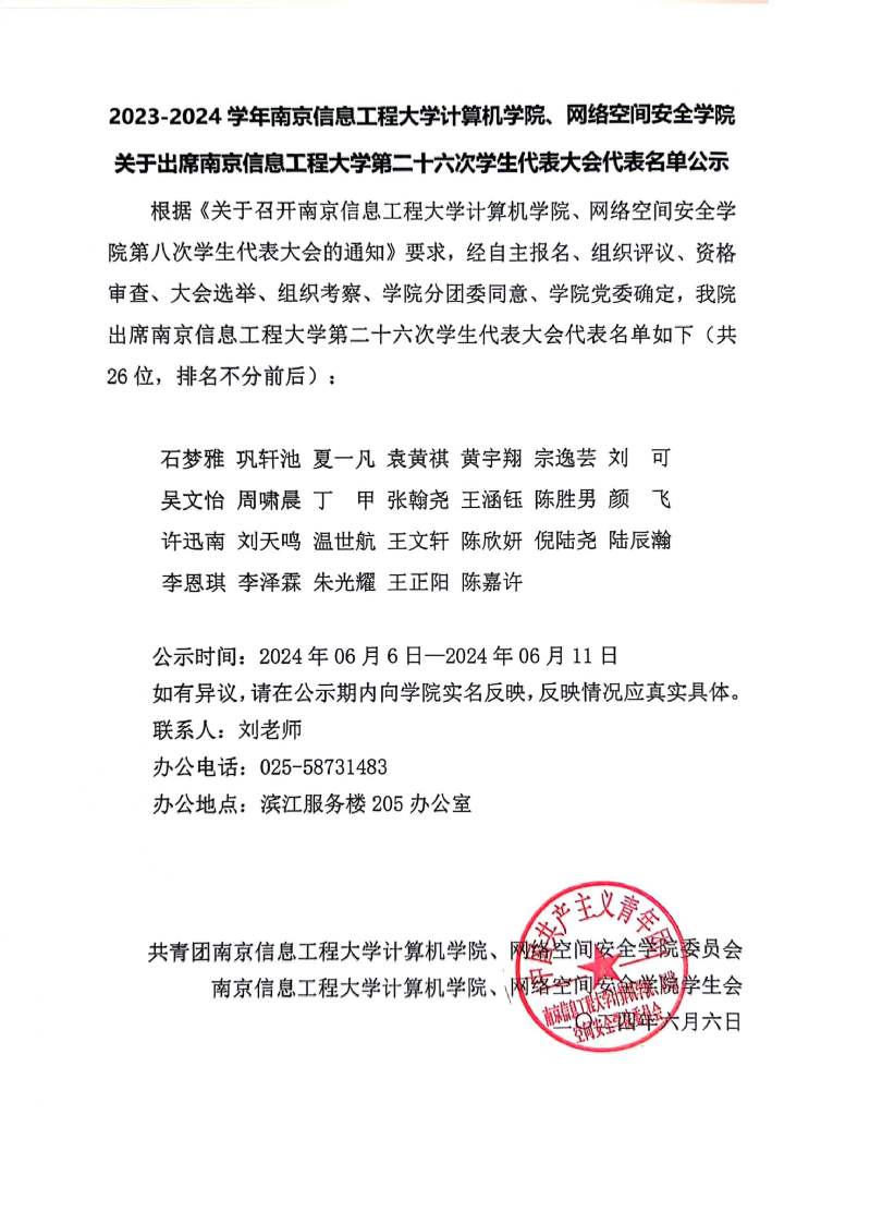 2023-2024学年世界杯平台世界杯(中国)、网络空间安全学院关于出席世界杯平台第二十六次学生代表大会代表名单公示