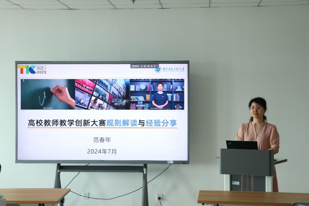第三届全国高校教师教学创新大赛二等奖获得者范春年老师介绍了教师教学创新大赛的规则解读和经验分享,她建议青年教师们要先从录制微课视频开始锻炼,积极参加各类青年教师教学竞赛,在备赛和比赛中打磨教学本领,提高教学水平。在参加教学竞赛时,要注重解决学无所用、个体差异等痛点问题,给出解决思路和措施,最终展示结果成效。在课程设计上要注重案例项目导入,课程中学生必须全程深度参与,让学生成为学习的主体。