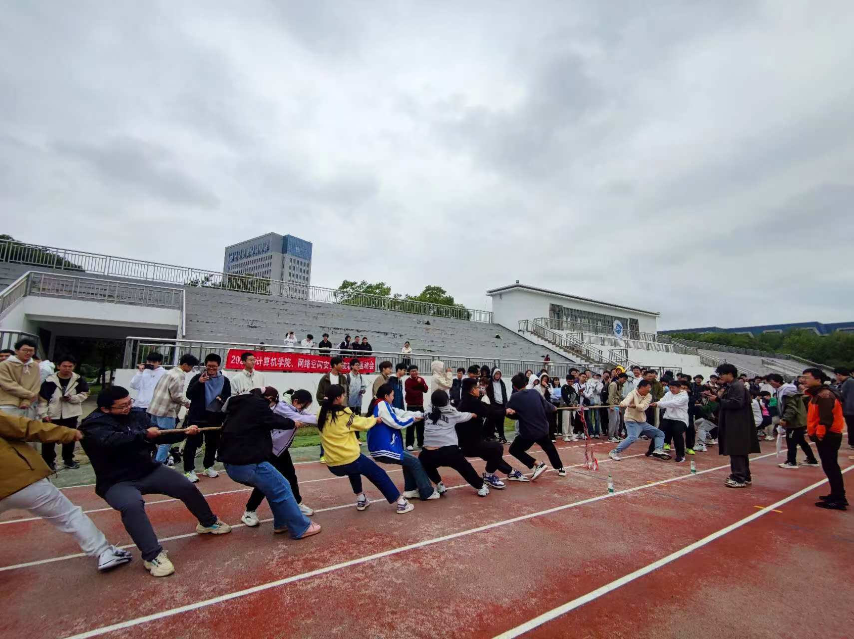 新生破冰拔河比赛的赛场上,运动员们以班级为单位,齐心协力,共同为班级的荣誉而战。同学们或竭力拉扯,或高声喝彩,或默默加油,每个人都为班级的胜利贡献着自己的力量。这份难能可贵的凝聚力和团体性,不仅让同学们更加熟悉彼此,更让他们深刻体会到了团结的意义。无论胜负如何,他们都不曾后悔,因为在这场比赛中,他们收获了友谊、学会了合作,更懂得了如何携手共进、迎接未来的挑战。最终,24计类2班荣获冠军、24计类3班荣获亚军、24计类12班荣获季军。