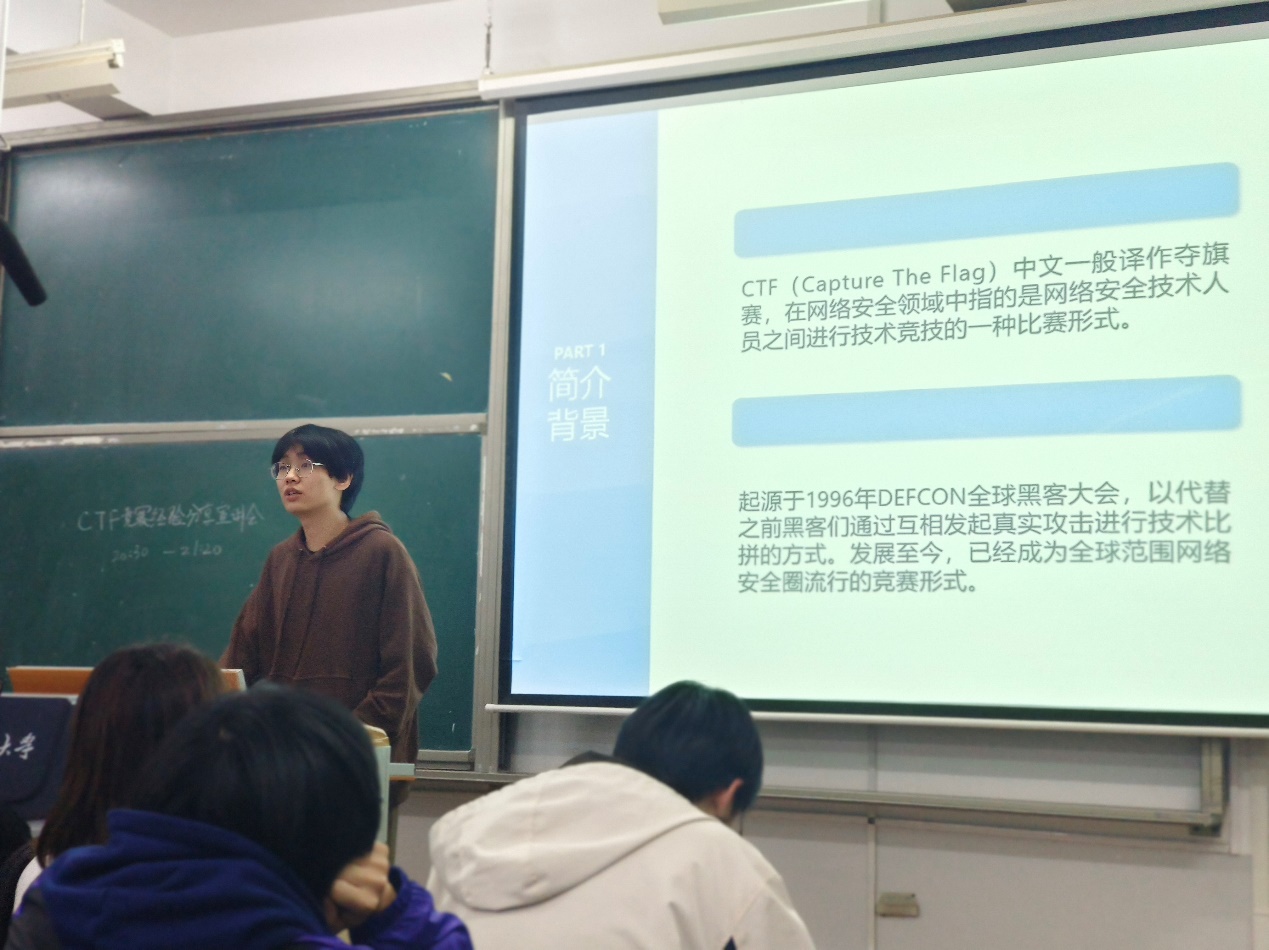 张景源是我校CTF集训队WEB方向学生负责人,曾获网络安全方向CISP-PTE认证(渗透测试工程师),在CTF竞赛方面有着较为丰富的经历和深厚的知识储备。他从CTF竞赛简介与大赛背景出发,向同学们详细介绍CTF竞赛的筹备、报名、参赛的各个流程以及其具体的三种竞赛模式,同时对与CTF相关的诸多赛事与知名团队进行拓展补充。张景源以实际项目为例,联系WEB3.0技术,向同学们一一讲解“逆向、加密、杂项、PWN、WEB”等方向,并举例“对应数据的调用和支付漏洞中对数据包的拦截修改”向同学们展示其具体实践。最后,张景源鼓励大家积极参与到CTF竞赛中,以赛促学,锻炼自身能力,提高自身的综合竞争力。