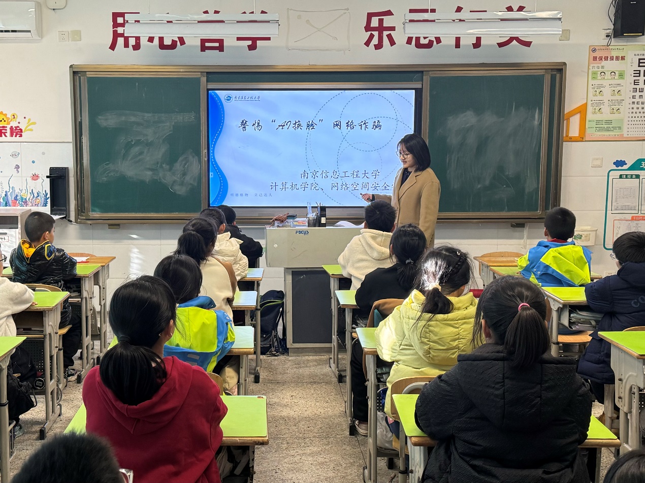 为进一步提升大学生社会实践能力,助力提高小学生“识诈、防诈、拒诈”能力,护航青少年健康成长,11月27日,世界杯(中国)、网络空间安全学院在世界杯平台附属实验小学五年级(1)班举办了一场别开生面的“警惕‘AI换脸’诈骗”主题教育活动。活动由院科协主席团成员、第二学生党支部党员王译曼主讲,科协主席团其他成员及第二学生党支部的部分党员参与本次活动。