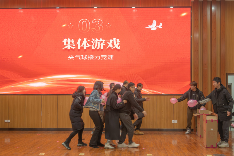 紧接着的是四个工会小组在“听歌识曲”、“夹气球接力竞速”以及“古诗词消消乐”三个集体游戏中的较量和比拼。在“听歌识曲”游戏中,教职工们纷纷化身音乐达人,耳熟能详的旋律一响起,便有人迅速报出歌名,展现出了不俗的音乐素养。而“夹气球接力竞速”则考验了大家的团队协作能力和身体灵活性,各小组成员间默契配合,现场欢声笑语不断。至于“古诗词消消乐”,更是将传统文化与趣味游戏巧妙结合,教职工们在游戏中重温经典,感受中华文化的魅力。