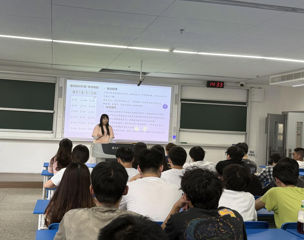 考公经验分享环节,上岸广东省选调区级组织部的黄腾杰介绍了选调生报考条件与竞争态势,强调夯实政治素养和日常关注时政的重要性,提醒同学们面试时要围绕基层工作思路。任紫萱分享了连云港市选调生的选岗技巧,她建议同学们在报名时,要综合考虑地域、岗位和自身优势,同时,她还分享了行测“分阶段突破”和申论拆解范文的备考策略。考取盐城市选调生的陈敬予提醒大家在备考期要及时调整心态,他建议同学们可以通过制定小目标和复盘保持热情,积累时政素材。考入徐州市公安局的程海桐指出公安岗位需加试专业知识,要强化应用能力,提前进行体能储备。