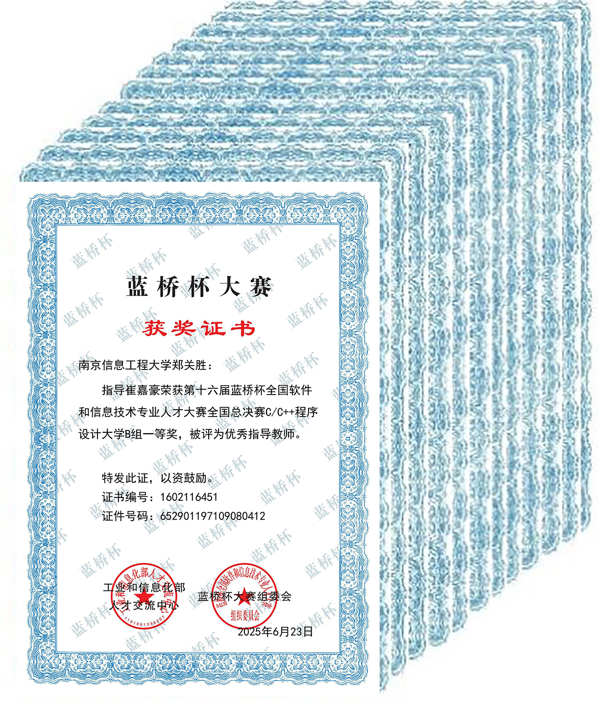 | 蓝桥杯C/C++程序设计 | 崔嘉豪 | 计算机院 | 郑关胜 | 全国一等奖 |